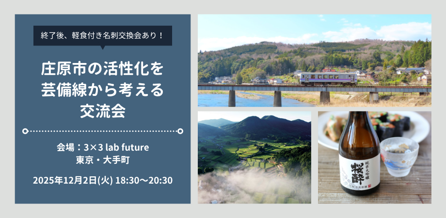 そして12月、庄原市の課題解決を志し、応援くださる企業やプレイヤーの方を関係人口化するプロジェクトを始めます。その第一歩として、12月2日に3×3 Lab Futureで交流イベントを開催します。
